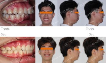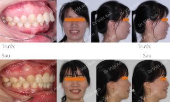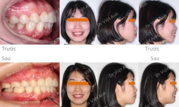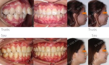 Hình ảnh trước khi niềng răng tại trung tâm niềng răng chuyên sâu Thạc sĩ Bác sĩ nội trú Việt Anh: góc nghiêng bị vẩu, môi nhô, răng hàm dưới lộn xộn, hàm trên chìa Phương án niềng răng mắc cài kim loại: nhổ 4 răng số 4, hàm trên căm 2 vis, kéo lùi…