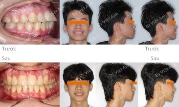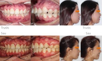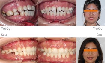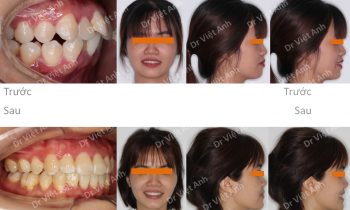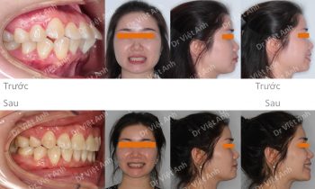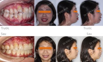 Hình ảnh trước khi niềng răng tại trung tâm niềng răng chuyên sâu Thạc sĩ Bác sĩ nội trú Việt Anh: răng khấp khểnh nặng, 2 chiếc răng cửa tụt hẳn vào trong, góc nghiêng hô nhiều, cằm lẹm, đường giữa 2 hàm lệch nhau Phương án niềng răng mắc cài pha lê: nhổ 4…